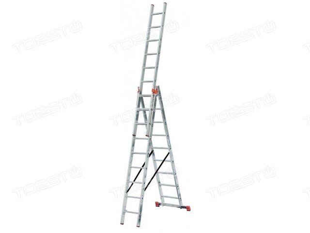 По своей конструкции алюминиевая трехсекционная лестница 3х10 схожа на обыкновенную лестницу-стремянку, но без площадки и имеет третью выдвигающуюся секцию консольного вида. Таким образом, лестница из 3-х секций обеспечивает устойчивость изделия, позволяя при этом залезть на большую высоту. Так же такую модель можно применять как приставную лестницу.