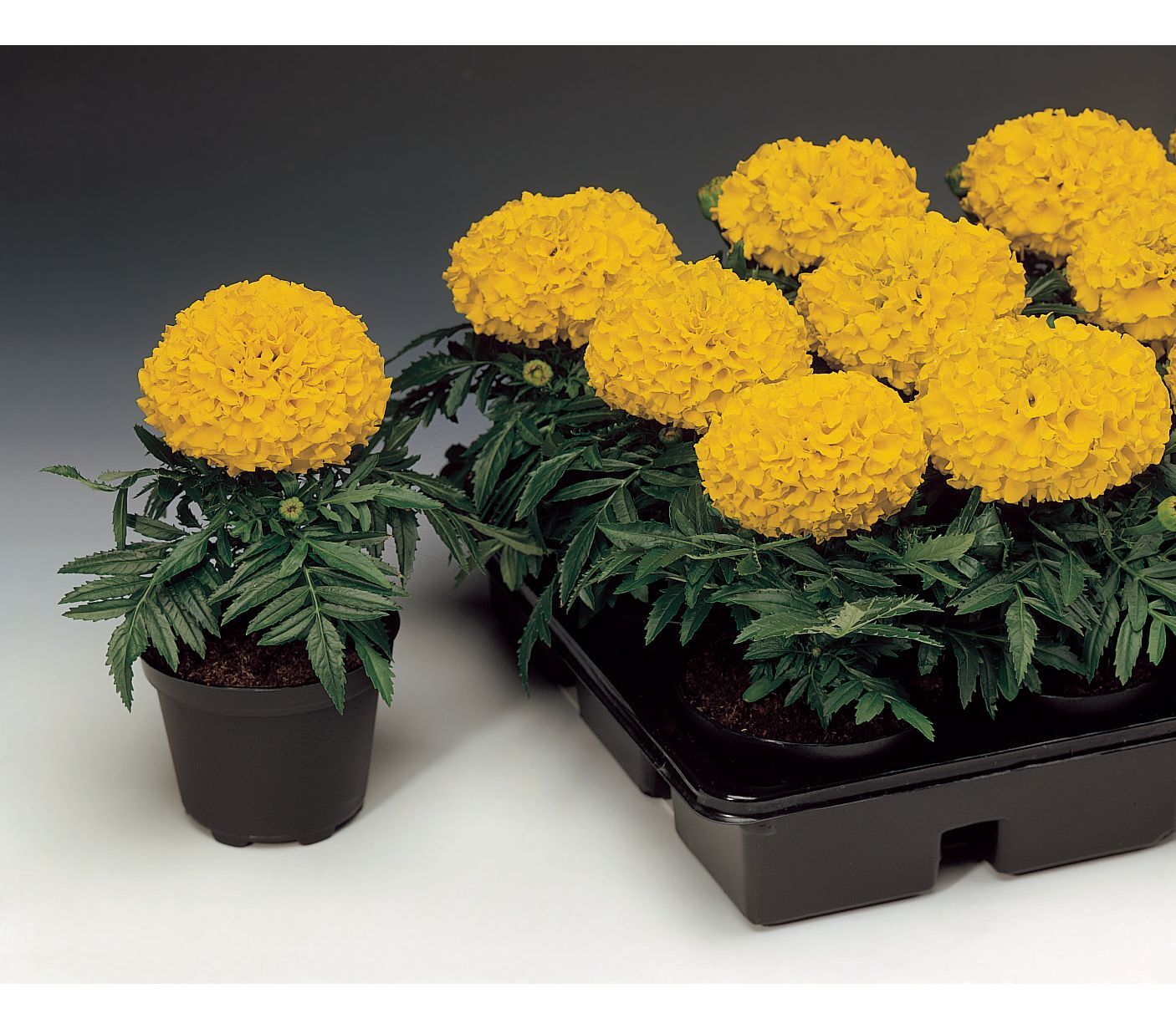 Обильноцветущие, крупноцветковые компактные бархатцы. Образуют аккуратные, выравненые по форме и размеру, сильноветвистые кустики высотой 25-30 см и шириной 15-20 см. Соцветия O 5-7 см располагаются выше листвы. Растения неприхотливые, развиваются быстро, зацветают рано. Пышное цветение сохраняется весь сезон, до первых заморозков. Вредителями и болезнями не повреждаются, легко переносят дождливую и ветреную погоду. Идеальны для бордюрных посадок, украшения клумб, прекрасно подходят для выращивания в горшках и балконных ящиках.