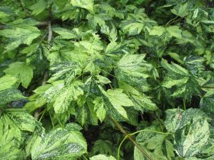 Крупное привитое дерево до 20 метров высотой с широкопирамидальной кроной. Листья при распускании желтовато-розовые, позднее пестрые с многочисленными белыми прожилками. Нижняя часть листа серовато-зеленые. Растет умеренно быстро по 30-40 см. в год. Ствол прямой.