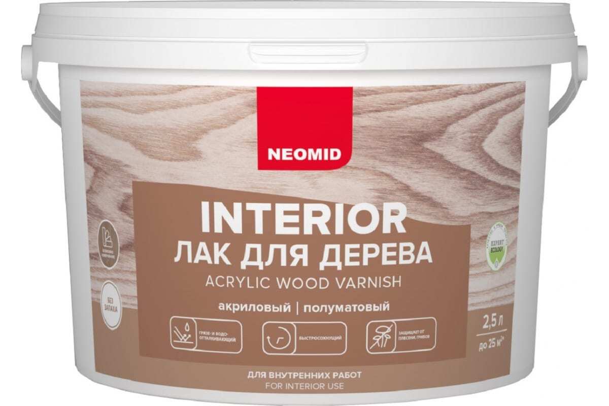 Лак «Неомид Interior» предназначен для эффективной защиты и финишной декоративной отделки поверхности древесины внутри помещений и под навесом. Быстросохнущий, водорастворимый. Практически не имеет запаха. Сохраняет и подчёркивает естественную структуру древесины. Образует защитное полуматовое прозрачное покрытие с высокой эластичностью. Благодаря входящим в состав лака биозащитным добавкам предотвращает образование плесени. Не использовать для лакирования деревянного и паркетного пола.
