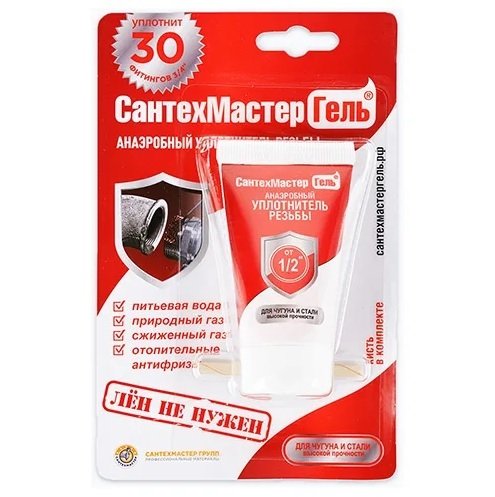 Гель Сантехмастер Красный, тюбик 15 г, блистер 04021 представляет собой анаэробный герметик, который служит для сверхпрочной фиксации и герметизации резьбовых соединений и фитингов из черного металла. Состав применяется для соединений диаметром от 1,5".