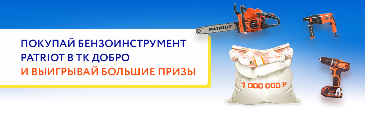 Со 2 апреля покупая бензоинструмент и садовую технику Patriot с бензиновым двигателем в ТК Добро — вы можете участвовать в розыгрыше, получить гарантированный приз и выиграть главный — 1 000 000 рублей!